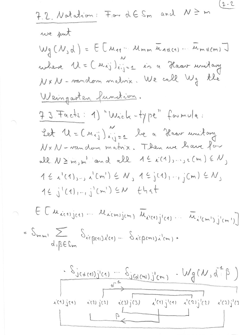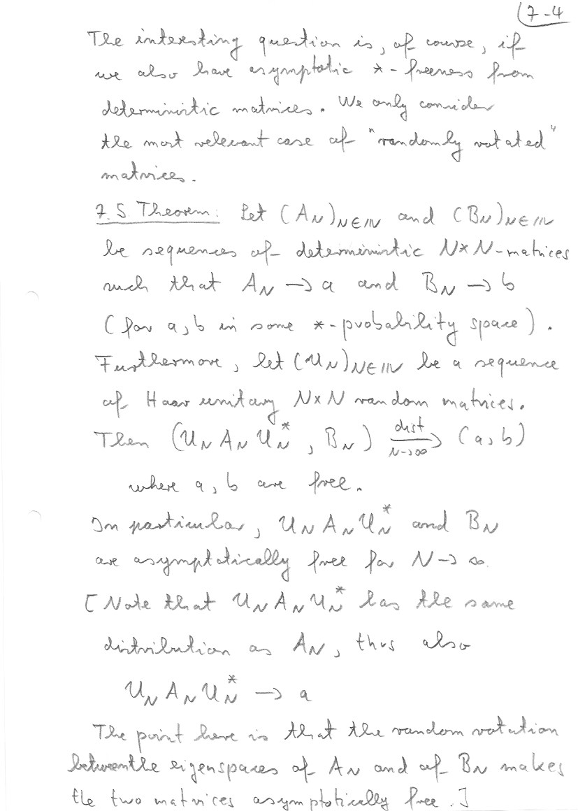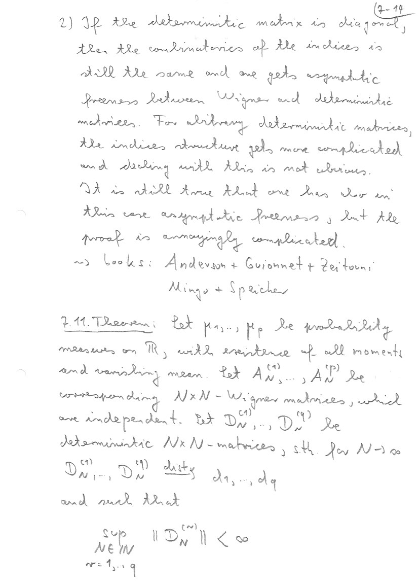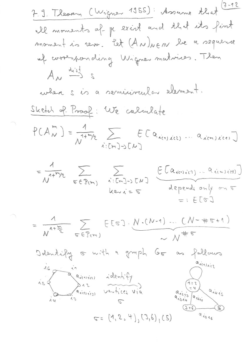 This section follows mainly Chapter 23 of my book with Nica. Details about the embedding of non-crossing partitions into permutations can be found there. At the end I also address the question of asymptotic freeness for Wigner matrices. Theorem 7.11 is from my book with Mingo, Section 4.4.